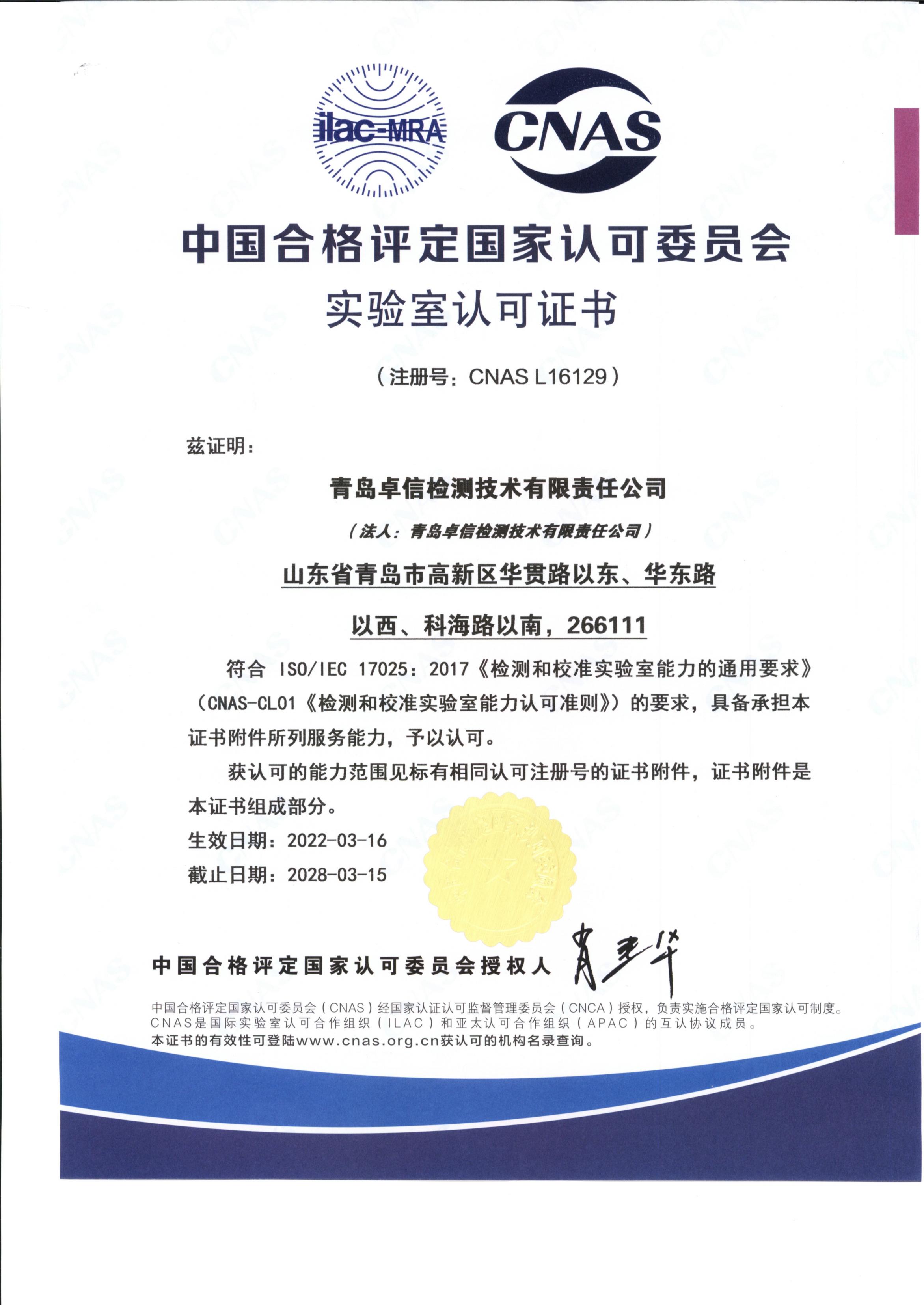 CNAS认可证书