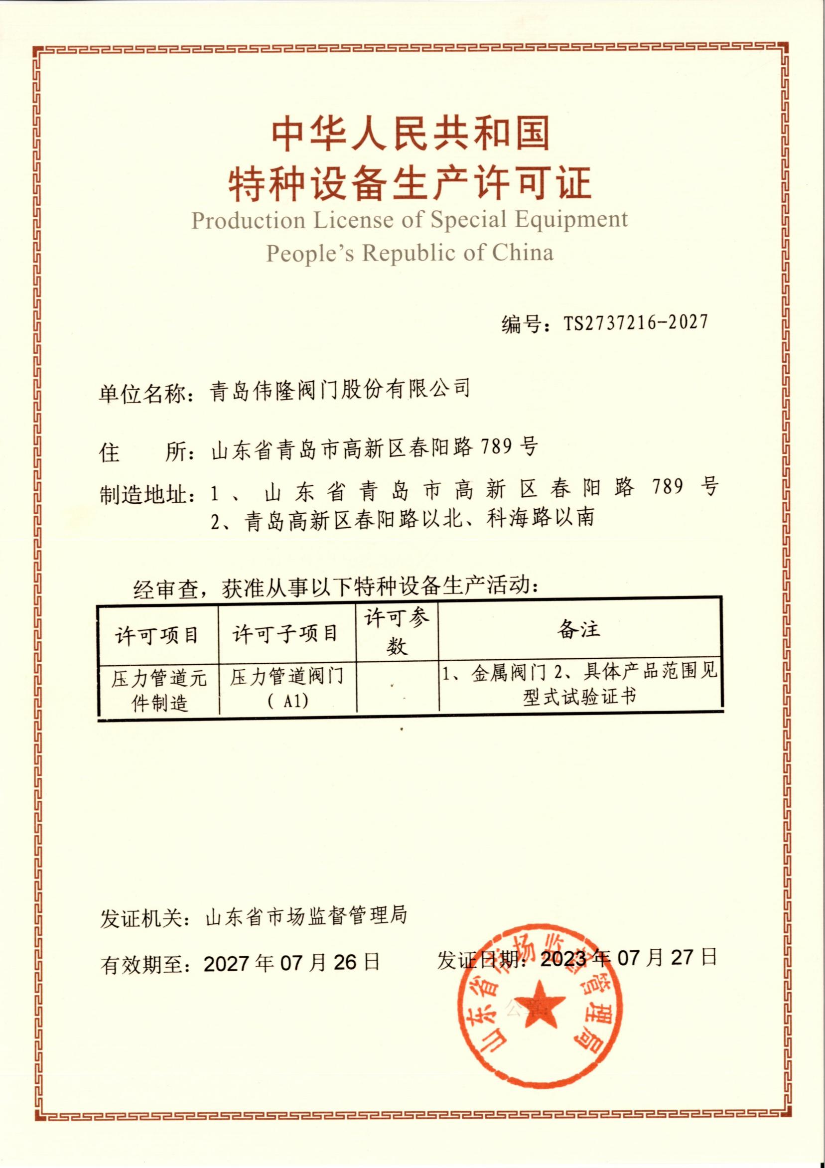 特种装备生产允许证