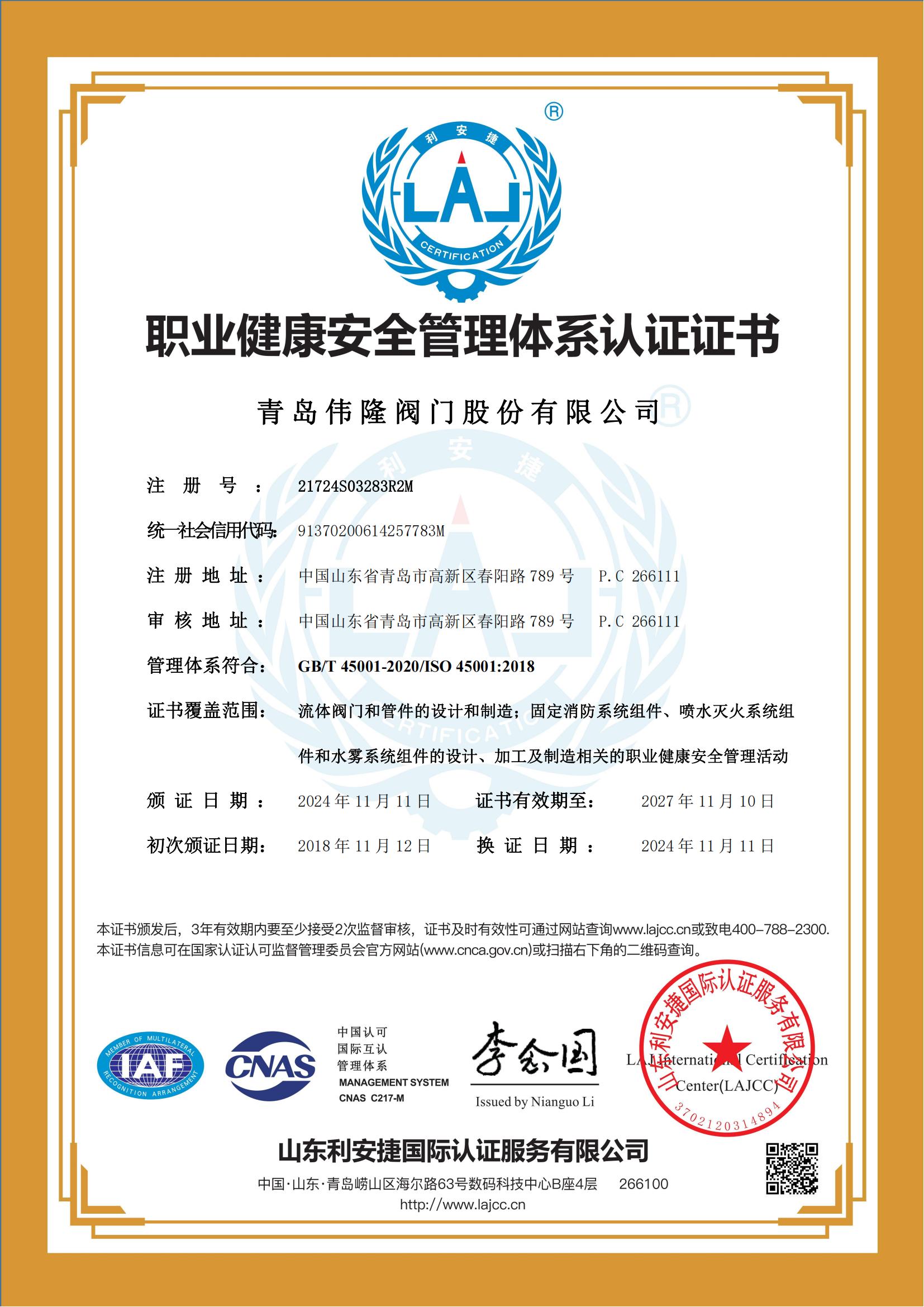 职业康健清静管理系统认证证书